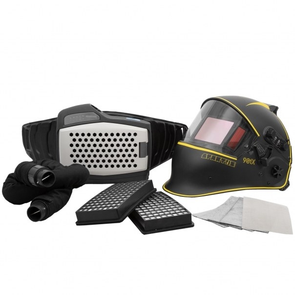 Settet inkluderer: SPARTUS® Pro 901X automatisk sveisehjelm ■ lufttilførselsslange med beskyttelseshylse ■ gnistfanger ■ 2 HEPA-hovedfiltre ■ 4 aktive kull-forfiltre ■ sele ■ litium-ion-batteri ■ lader  ■ bag ​